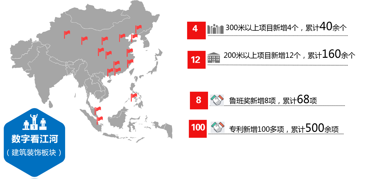 2017年,集團建筑裝飾板塊業(yè)務(wù)規(guī)模平穩(wěn)略增,但績效大幅提升,處于歷史最好水平。一年來,我們在海內(nèi)外接連中標北京城市副中心A1、A2、C2、昆明恒隆廣場、青島海天大酒店、印度尼西亞雙子塔等一大批有影響力地標工程,其中中標300米以上項目4個,累計40余個;200米以上項目12個,累計160余個;新增魯班獎8項,累計68項;新增專利105多項,累計500余項。行業(yè)龍頭地位凸顯,與第二梯隊拉開了差距,江河的金子招牌更亮了。