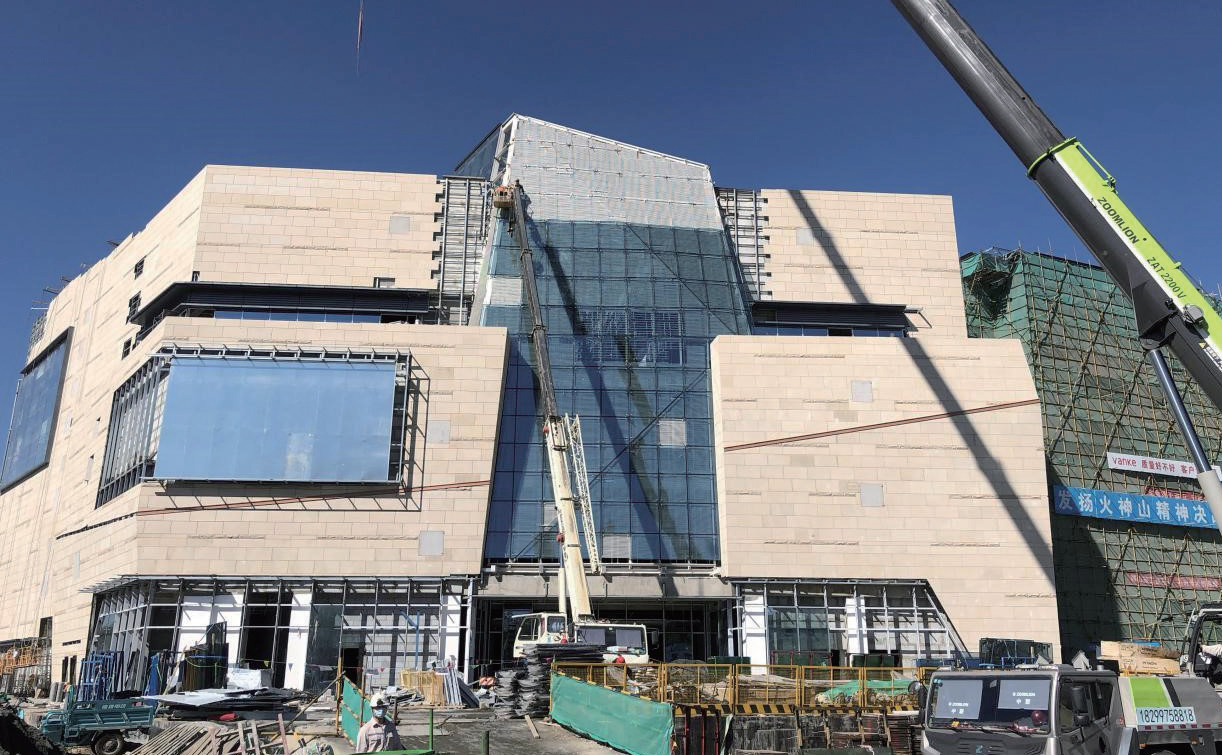 在整個幕墻系統(tǒng)安裝施工中,面積最大的部分是石材幕墻系統(tǒng),它是突出整體建筑效果的基礎(chǔ),為完美呈現(xiàn)項目的地域特點和建筑氣勢,凸顯民族工藝細(xì)節(jié),前期的選礦環(huán)節(jié)尤為重要,港源幕墻項目部組織業(yè)主親臨礦山開展實地考察,根據(jù)不同石材特性和施工需求進行分析論證,最終決定采用產(chǎn)自烏魯木齊本地的卡拉麥?zhǔn)淖鳛槟粔τ昧?。施工全階段十分注重石材防護,材料出廠前由項目組對石材進行六面防護措施檢查,其中,防護劑的使用降低了酸雨對石材的浸入。石材掛裝完畢后再由專業(yè)人員對石材表面進行清洗維護,嚴(yán)謹(jǐn)?shù)姆罎B防污措施能有效避免成品損壞或墻體污染,保證了幕墻施工質(zhì)量和最佳展示效果。