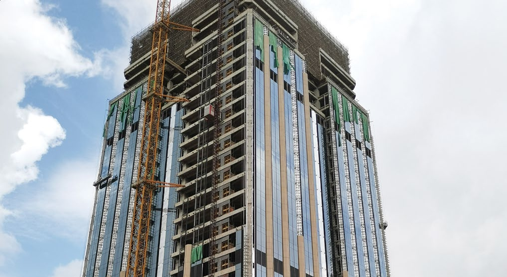 廣州天河區(qū)金融城起步區(qū)地塊基本處于開挖基坑狀態(tài),使得眼前動(dòng)工的項(xiàng)目恰似一座火熱的“孤島”。在主體結(jié)構(gòu)進(jìn)度嚴(yán)重滯后的情況下,幕墻有效施工時(shí)間為40天,造成了項(xiàng)目工期緊、作業(yè)場地環(huán)境 復(fù)雜。面臨首、二層大堂超大玻璃施工、較大石材單元柱施工、較高鋁板開啟扇施工和吊籃搭設(shè)等施工難題,但港源幕墻項(xiàng)目團(tuán)隊(duì)一往無前,將難關(guān)逐個(gè)攻破。
