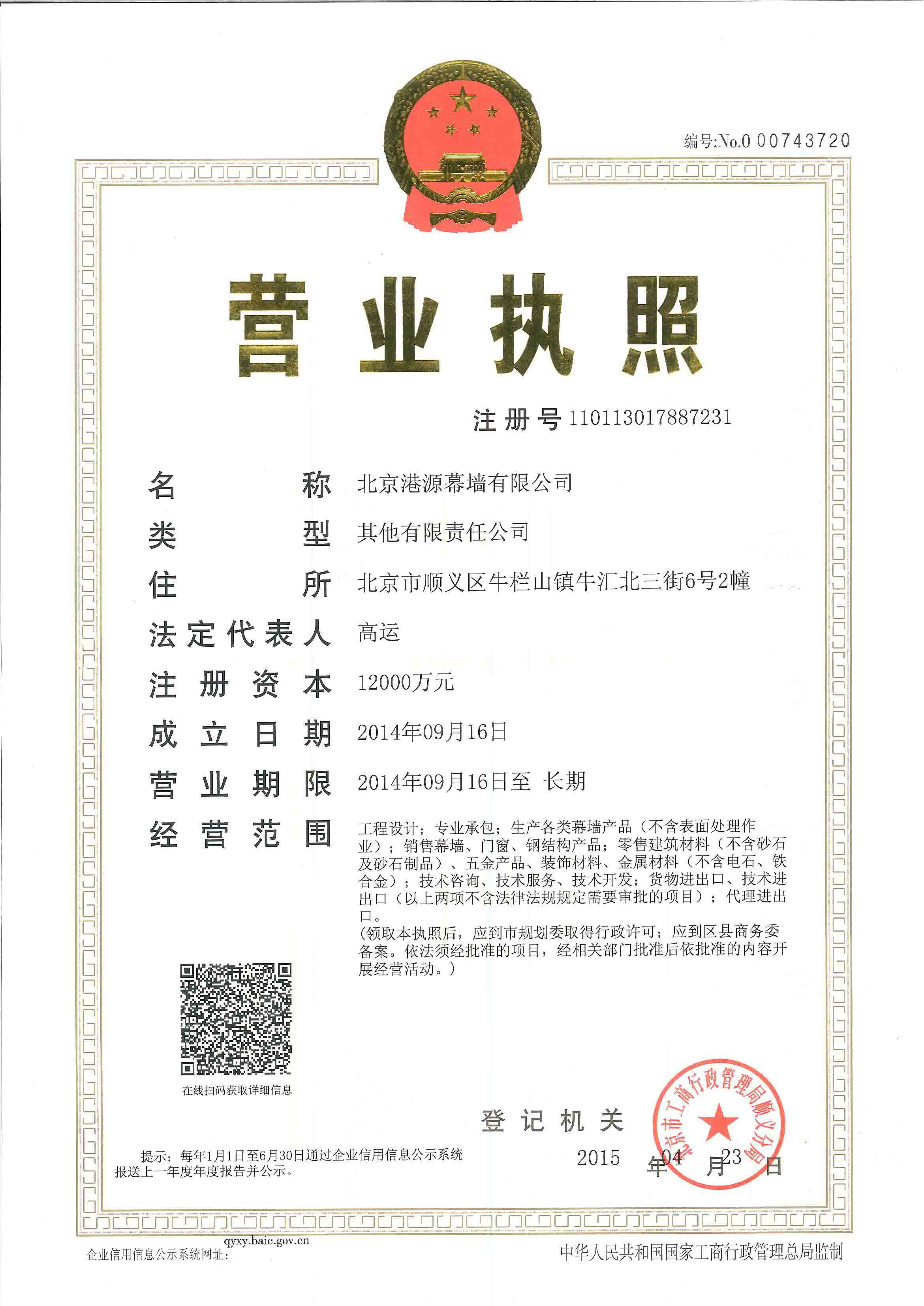 北京港源幕墻有限公司正式成立,注冊(cè)資金12000萬(wàn)元