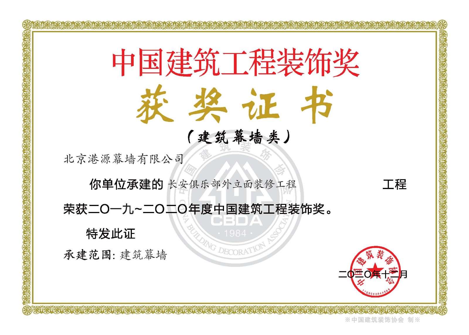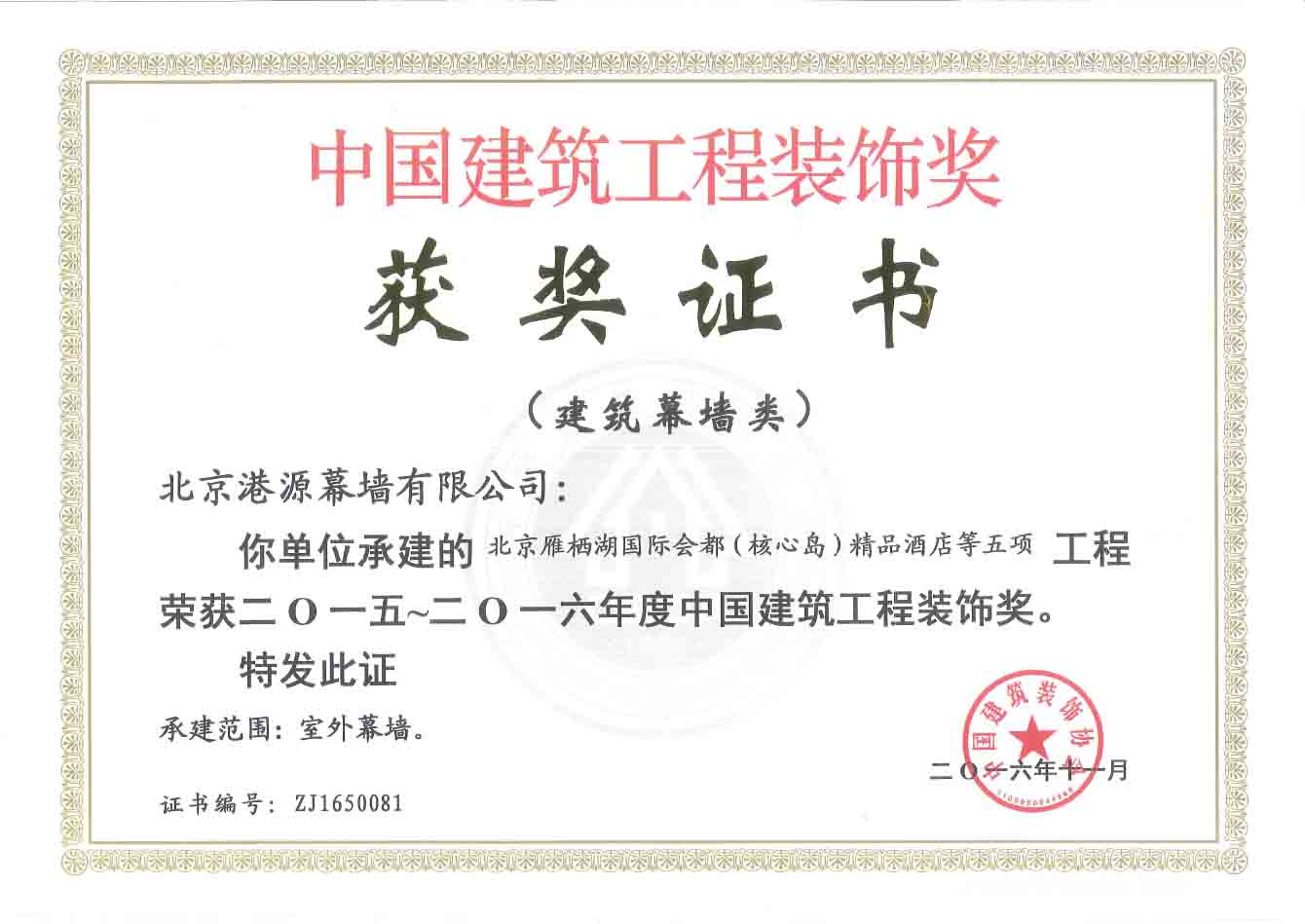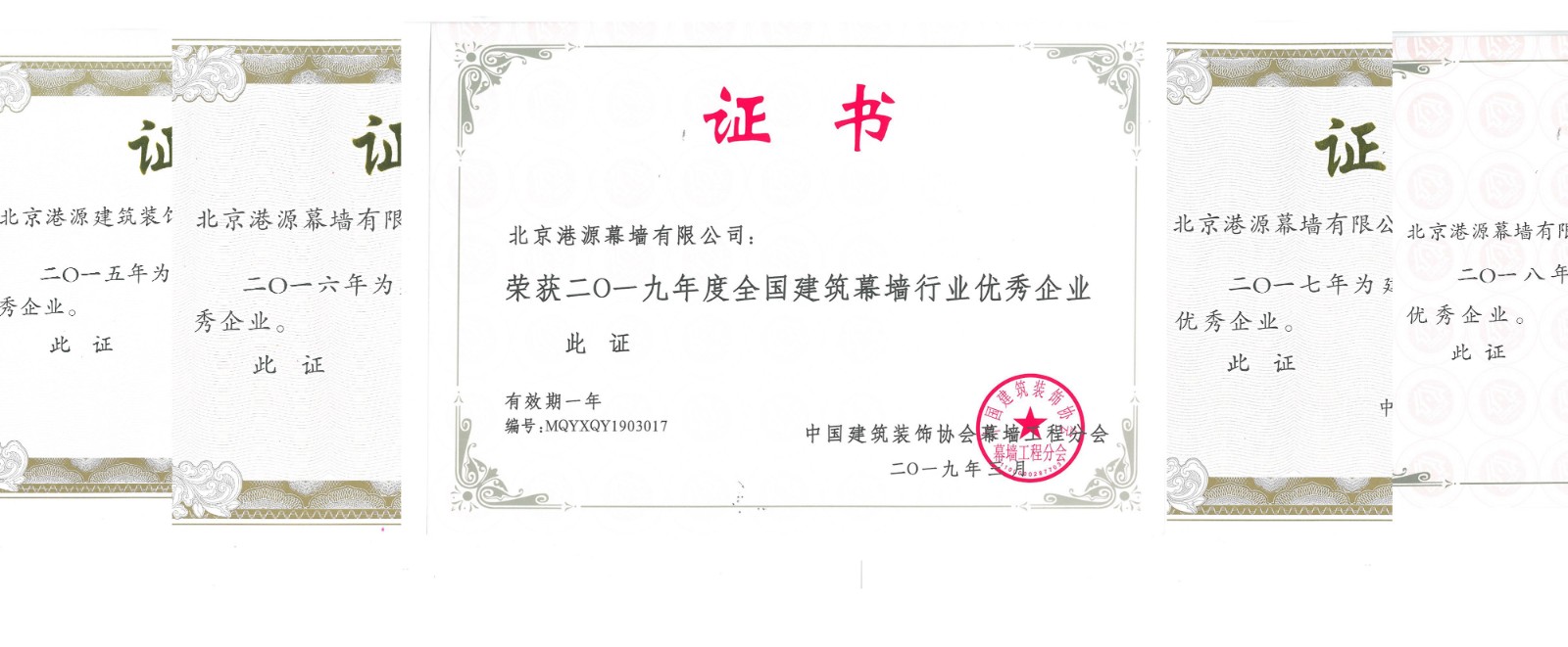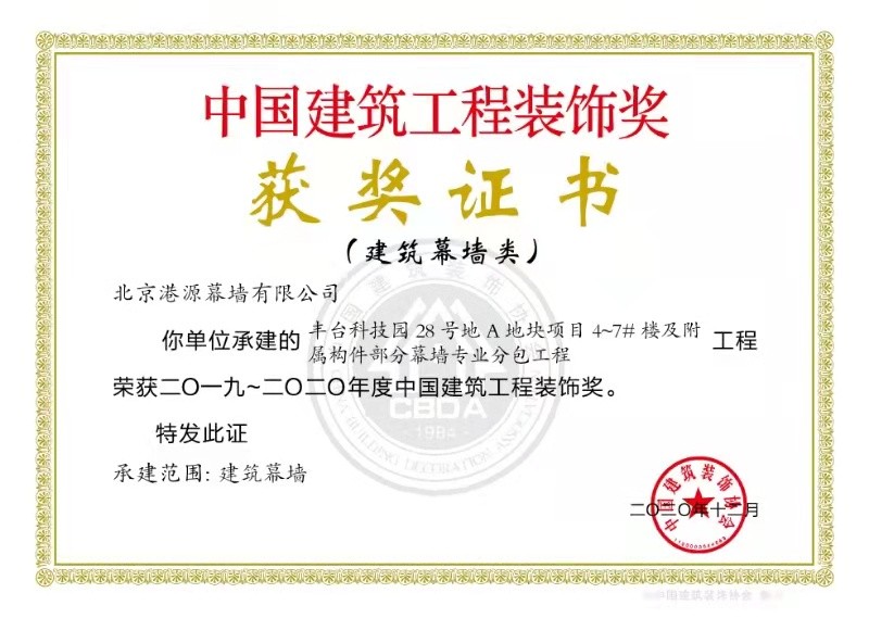 連續(xù)5年獲中國(guó)建筑裝飾協(xié)會(huì)頒發(fā)的《建筑幕墻行業(yè)推薦優(yōu)秀企業(yè)》
