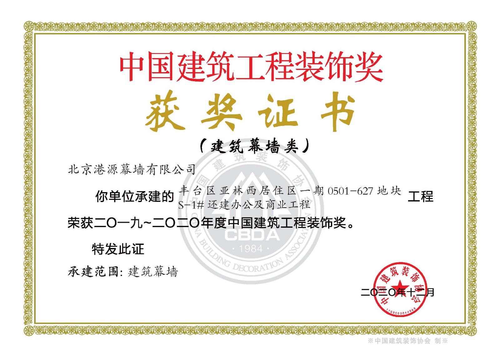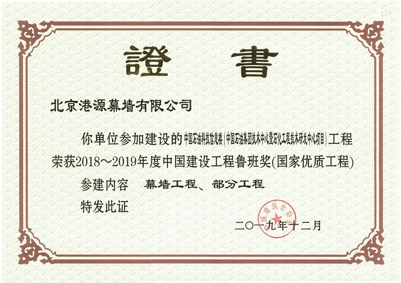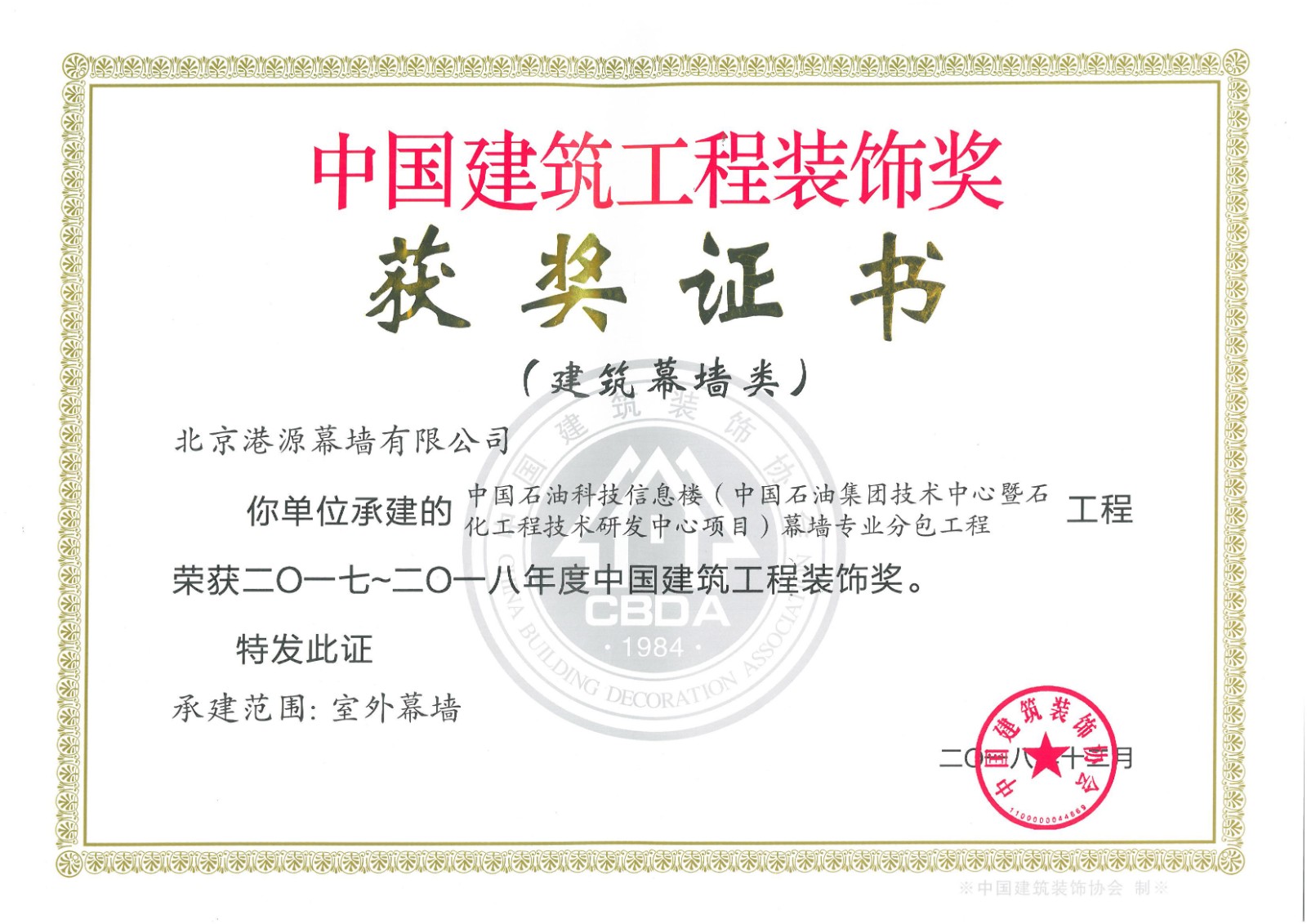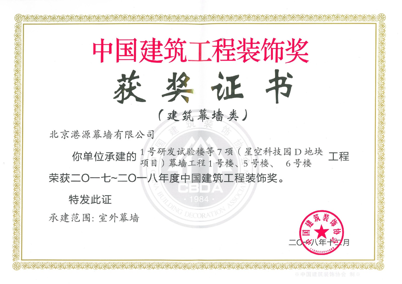連續(xù)5年獲中國(guó)建筑裝飾協(xié)會(huì)頒發(fā)的《建筑幕墻行業(yè)推薦優(yōu)秀企業(yè)》
