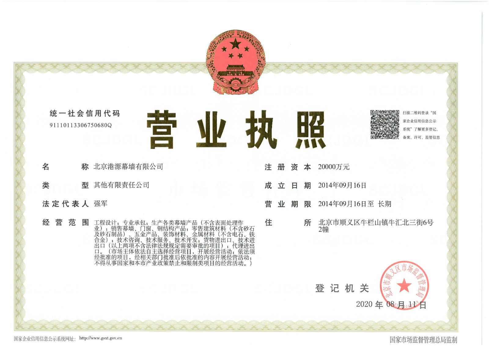 北京港源幕墻有限公司增加注冊(cè)資本為2億元