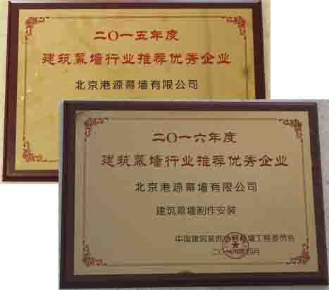 2016年4月,經(jīng)中國建筑裝飾協(xié)會幕墻工程委員會的專家聯(lián)合評審,港源幕墻榮獲“建筑幕墻制作安裝推薦優(yōu)秀企業(yè)”,這是港源幕墻連續(xù)兩年獲得該項殊榮,充分體現(xiàn)行業(yè)專家對港源幕墻專業(yè)技術的認可。